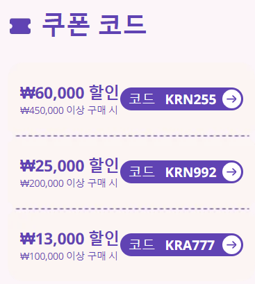 제품 가격대 별로 쓸 수 있는 할인 쿠폰이 있습니다.