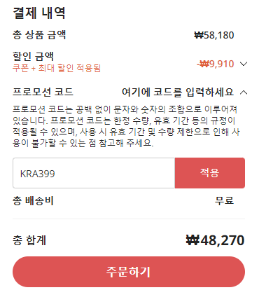 가격대를 보니 KRA399 쿠폰을 먹일 수 있네요. (7처넌 할인)