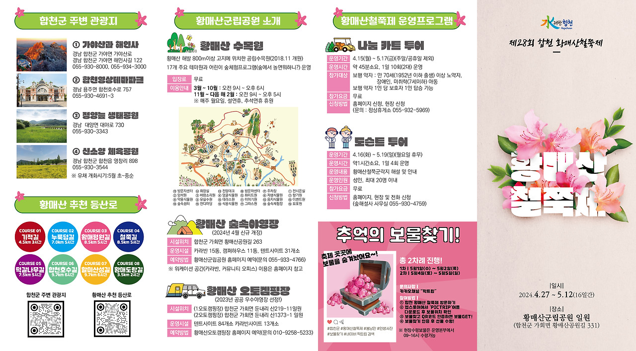 | 4.16(화)-5.19(일) | 황매산군립공원홈페이지 참고 | 황매산군립공원 - 술해설가와 함께하는 도슨트 투어 | 정상 주차장 출발 |